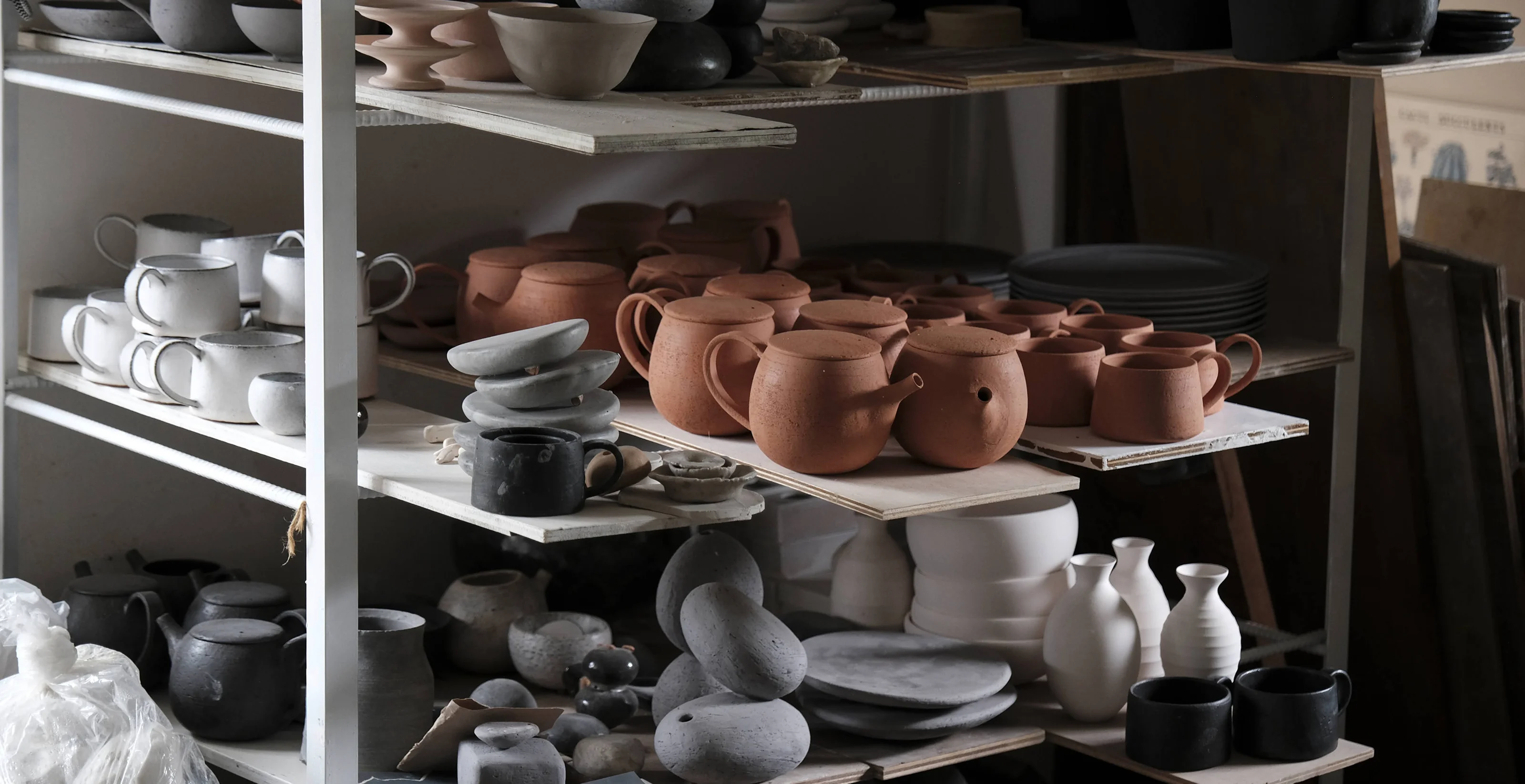 Pottery workshop interior with tools and works in progress