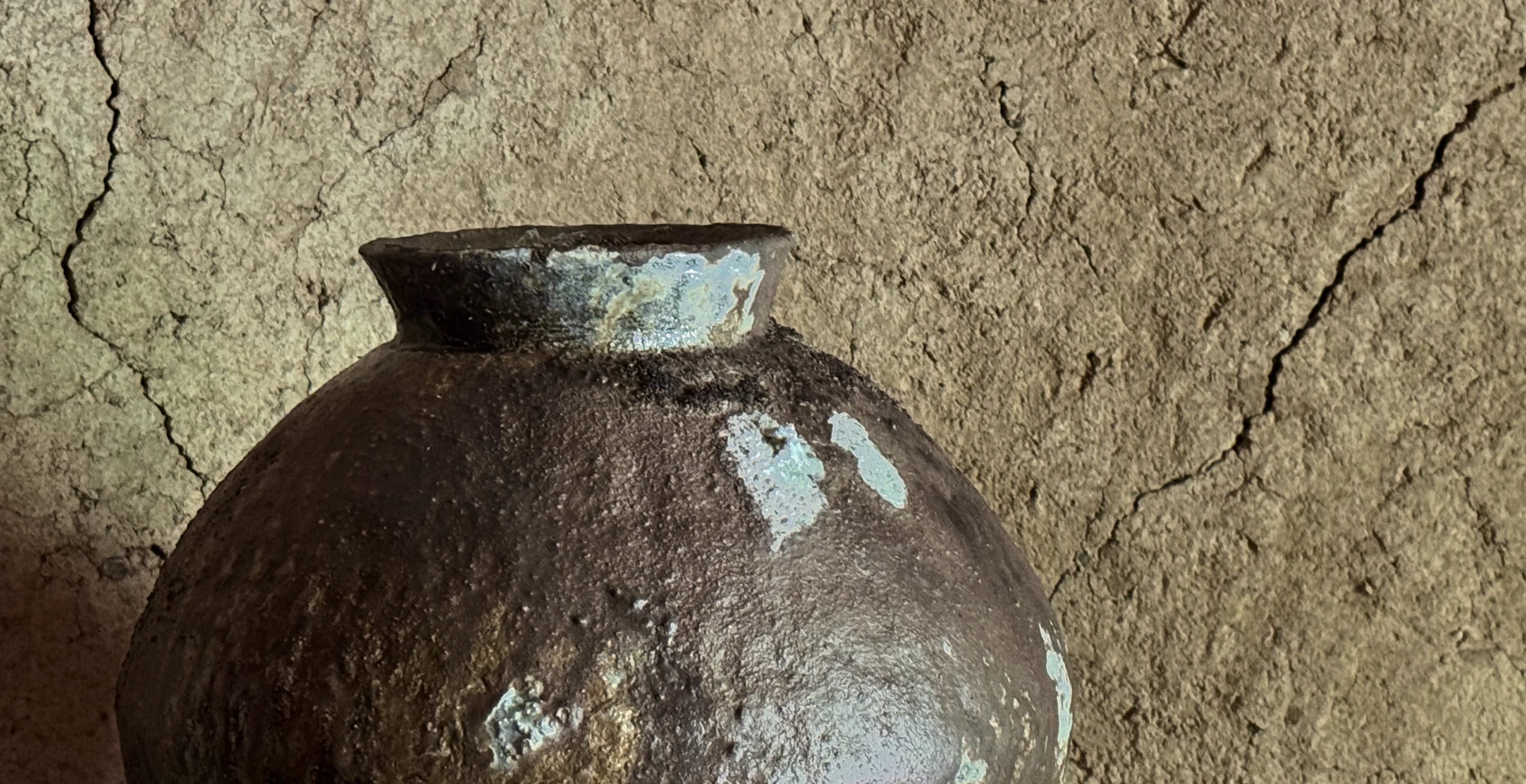 Close-up of glazed ceramic vessel with traditional patternsCollection of handmade pottery pieces in various stages